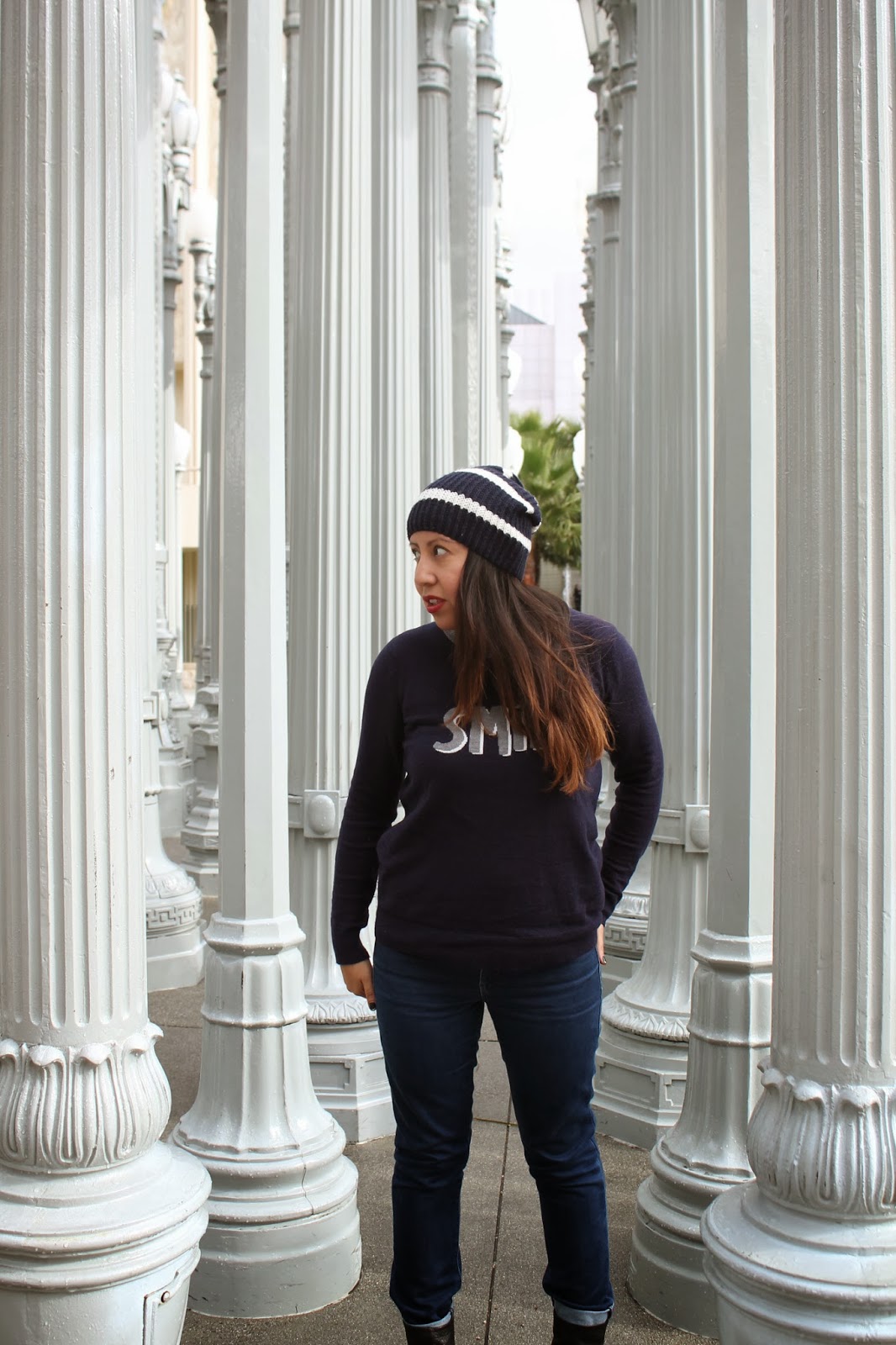 Oh navy, why do I love thee? I do, I truly do. When people ask me what my favorite color is, I usually say that I don’t have one. Which is true. I love all colors and textures. Navy though, has got to be one of the colors that make my heart skip a beat sometimes. I find it to be rich, and powerful. It’s no wonder that royalty has been known to wear different variations of the color throughout history. I could write a poem about my love for navy, but I’ll spear you from a sappy love letter at this time. If I look extra happy in these pictures, it’s because I’m at one of my favorite places in L.A., the LACMA museum. I can be there for days!