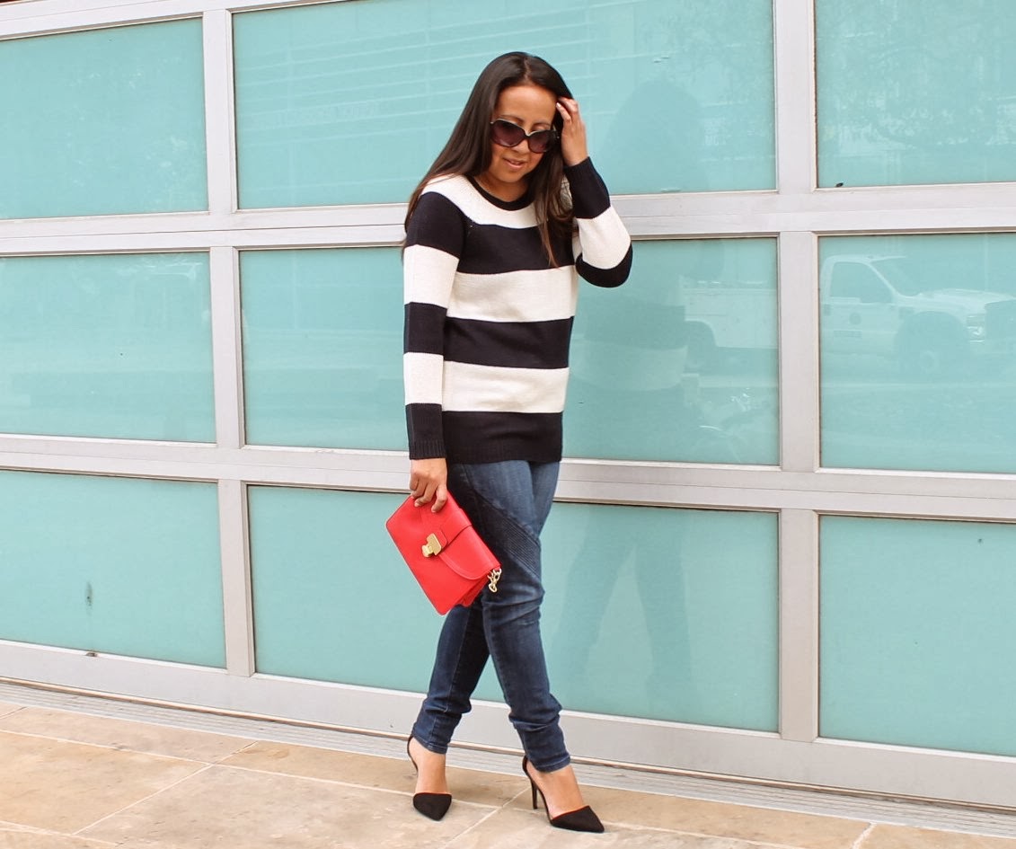 So simple, yet so classic. Stripes that is. I have blogged about my love for this pattern in the past, but I will never get tired of them. I haven’t done a look like this one before, so why not. You can dress this striped sweater up, or down. I did a little of both, going with jeans and black heels. A pop of red with the bag made this look magnifique! A little French for you. :))