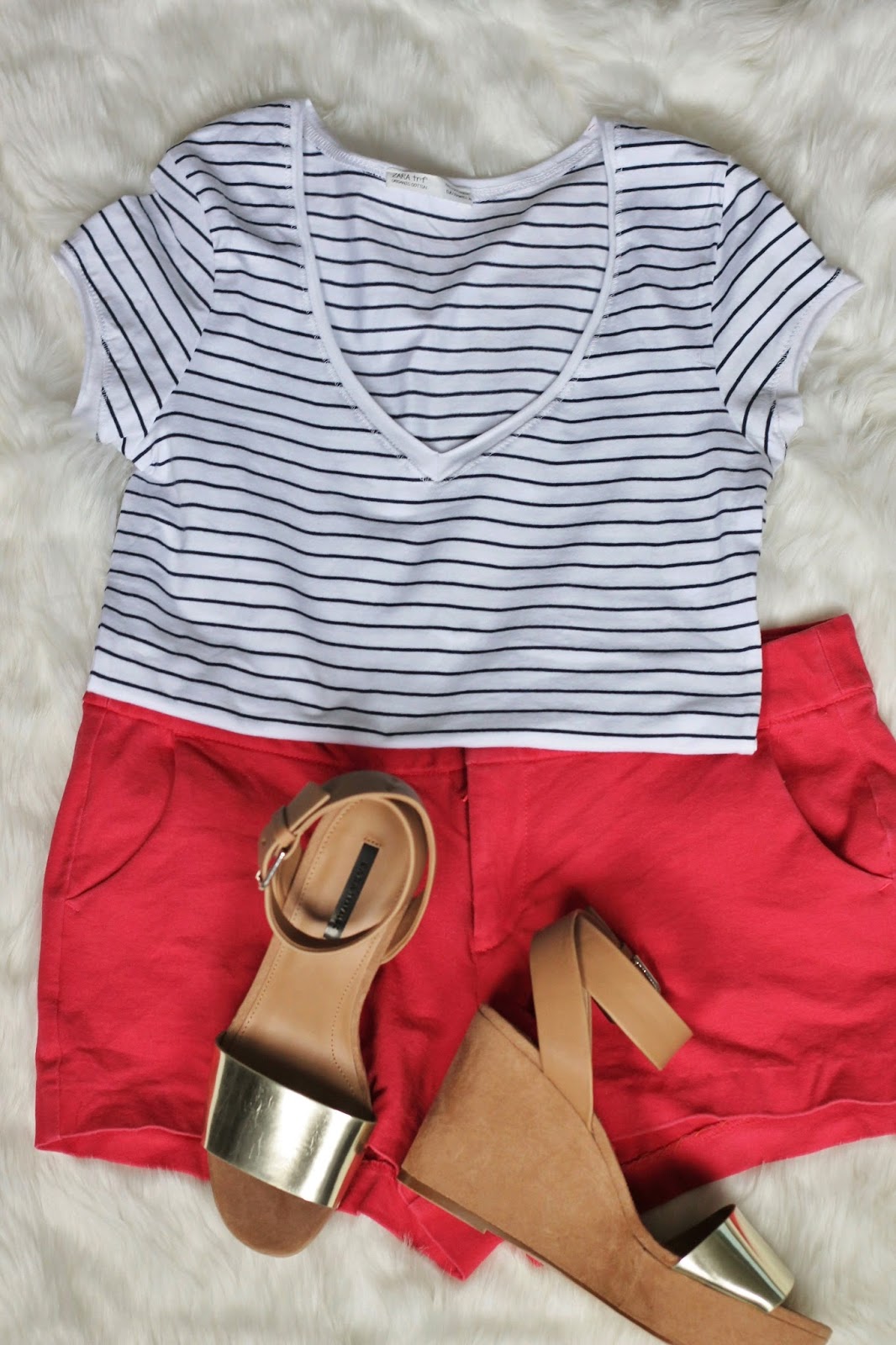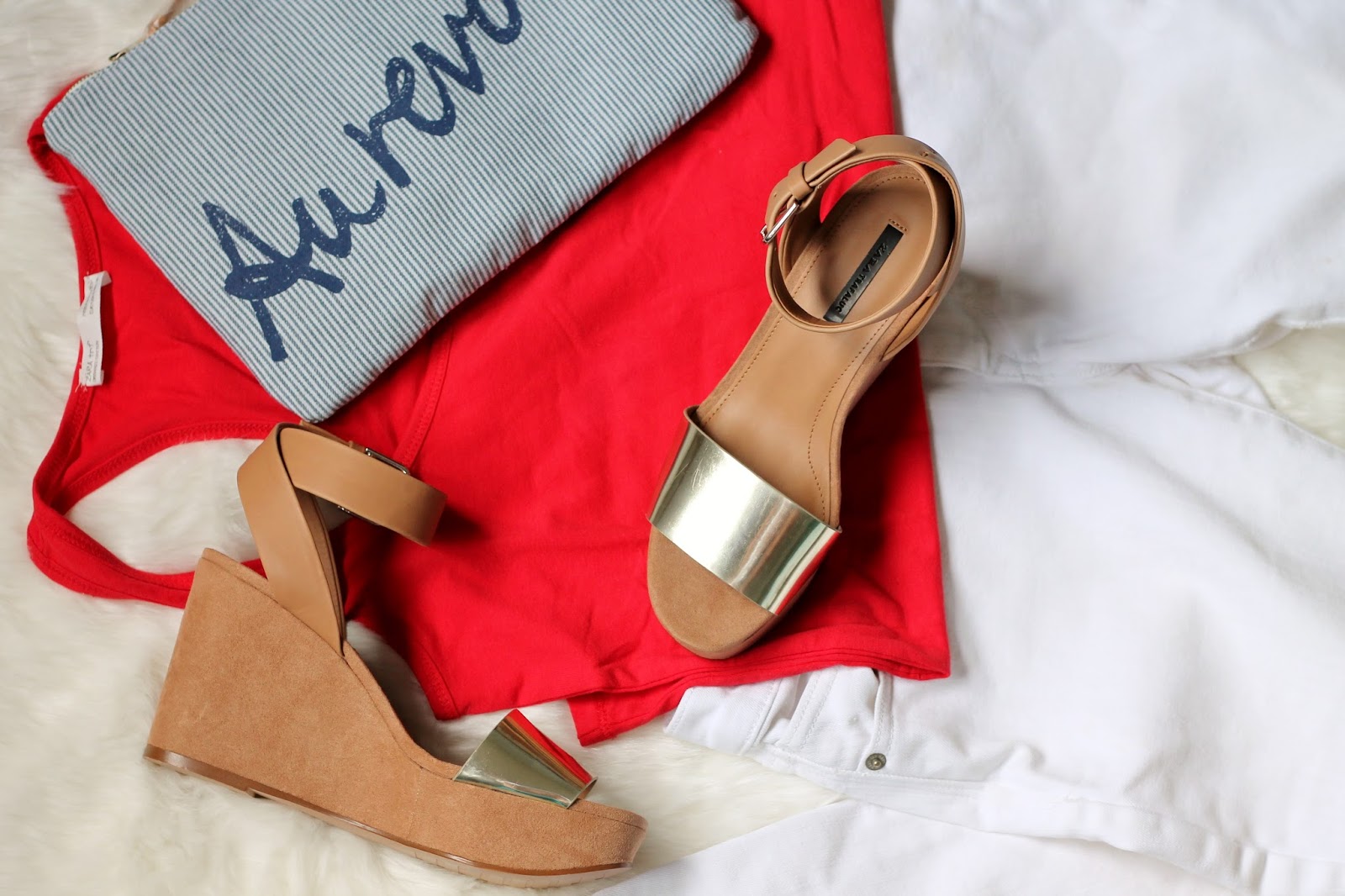 Of course I had to style these wedges for you! Being that our National Independence Day in the U.S. is this week, I went for patriotic colors. I even did a bonus outfit with shorts for you. Oh yeah, I had to throw in some Frenchy phrases with the purse and phone case. After all, the French did give us the Statue of Liberty in honor of our independence!