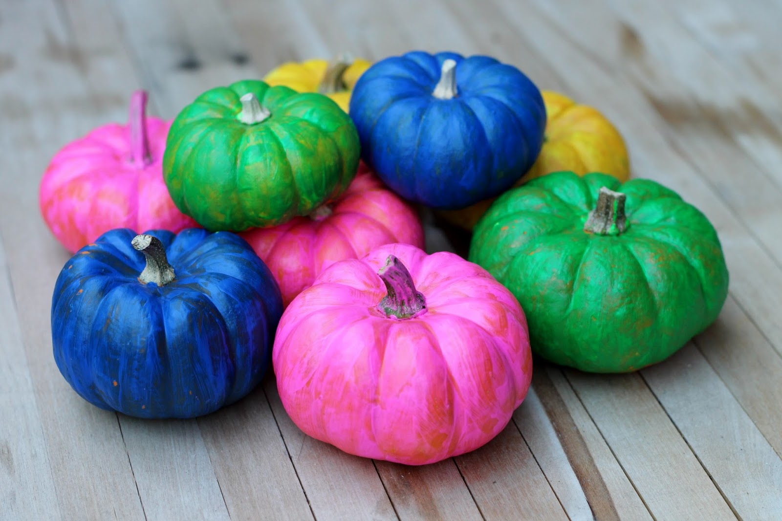 When I thought about a fun way to dress up my little pumkins for Halloween, I definitely wanted them to stand out from the crowd. Why should they look like every other pumpkin? I decided on neon paints because, pops of color brigten up my day.